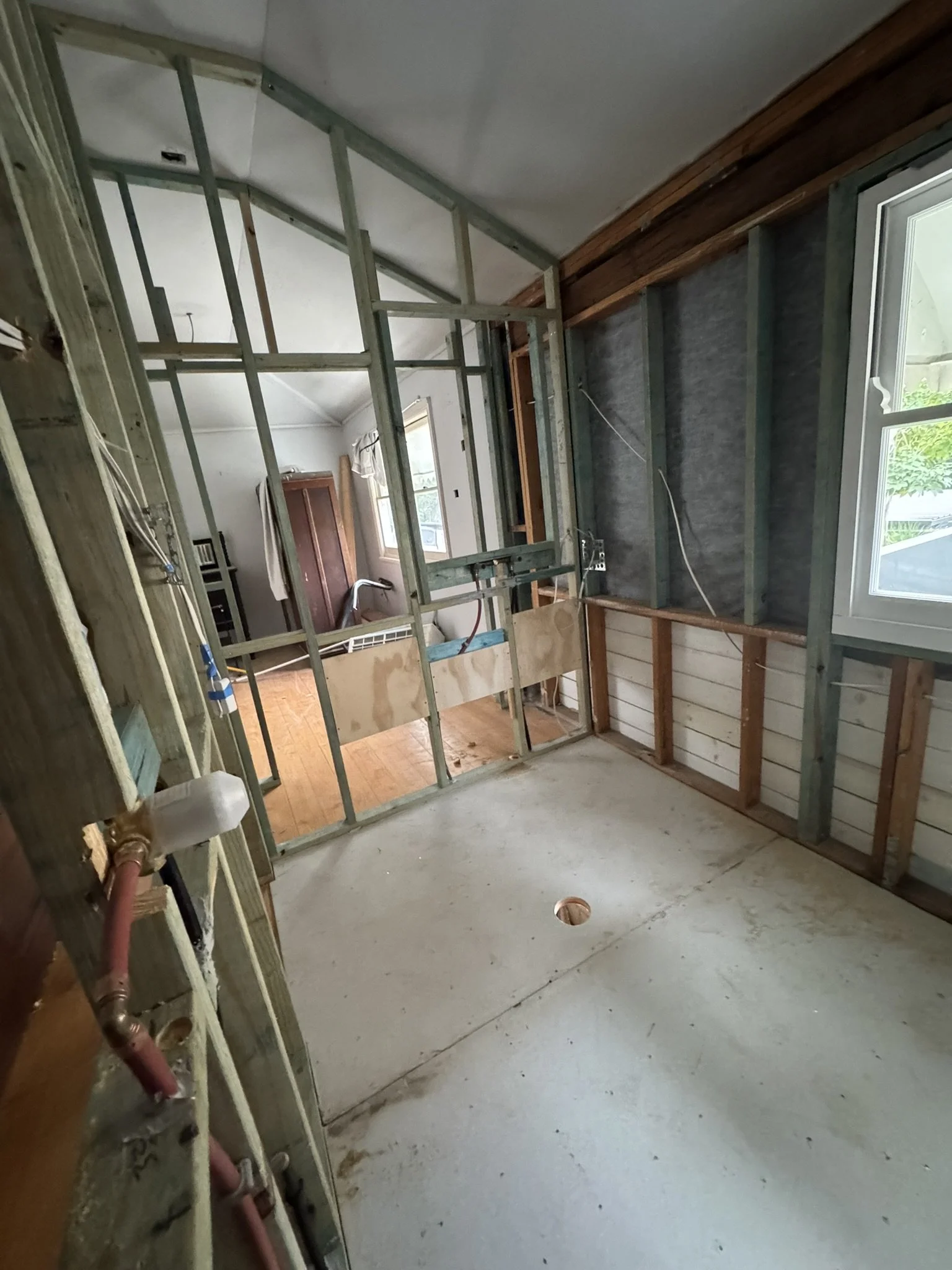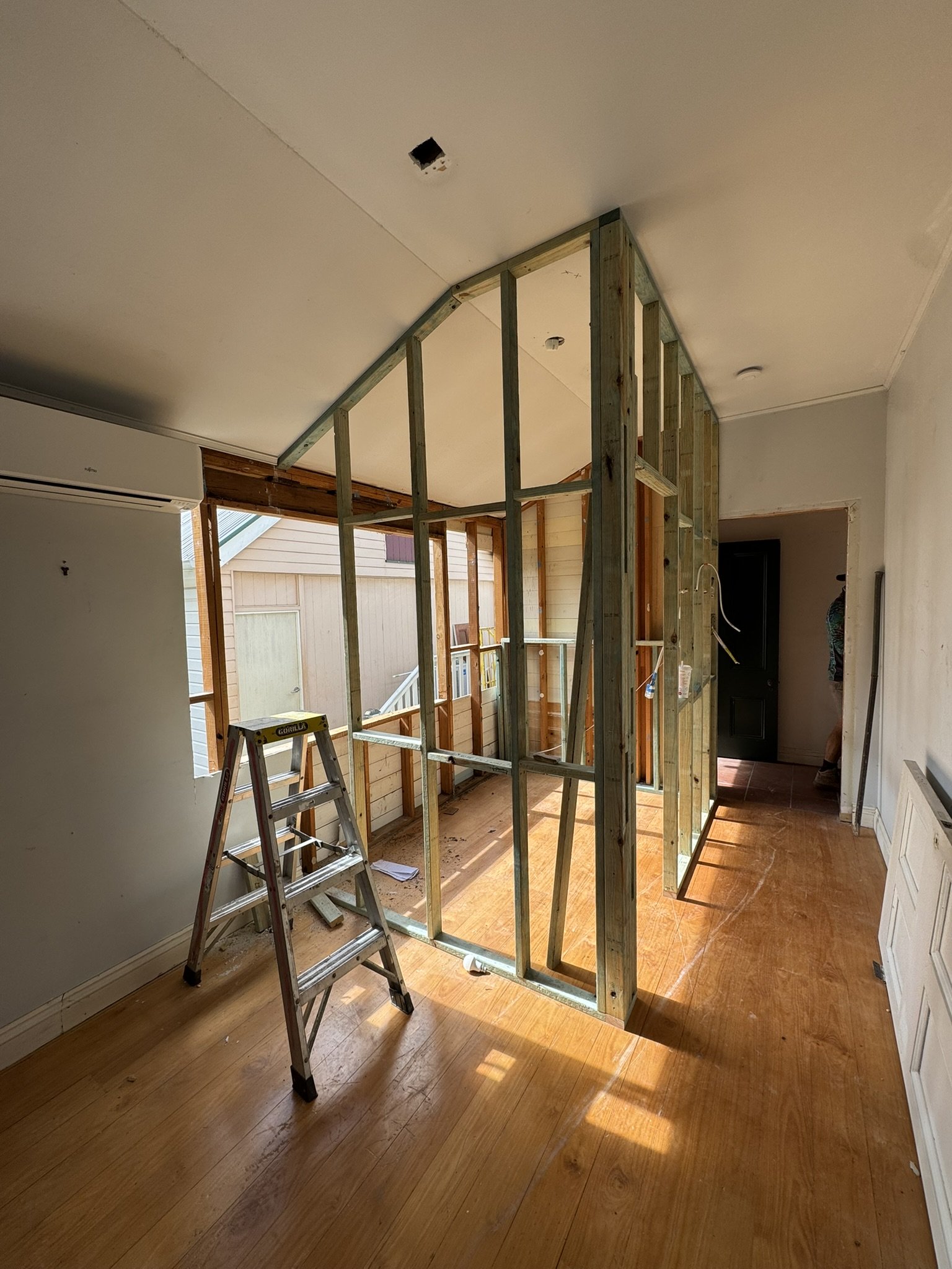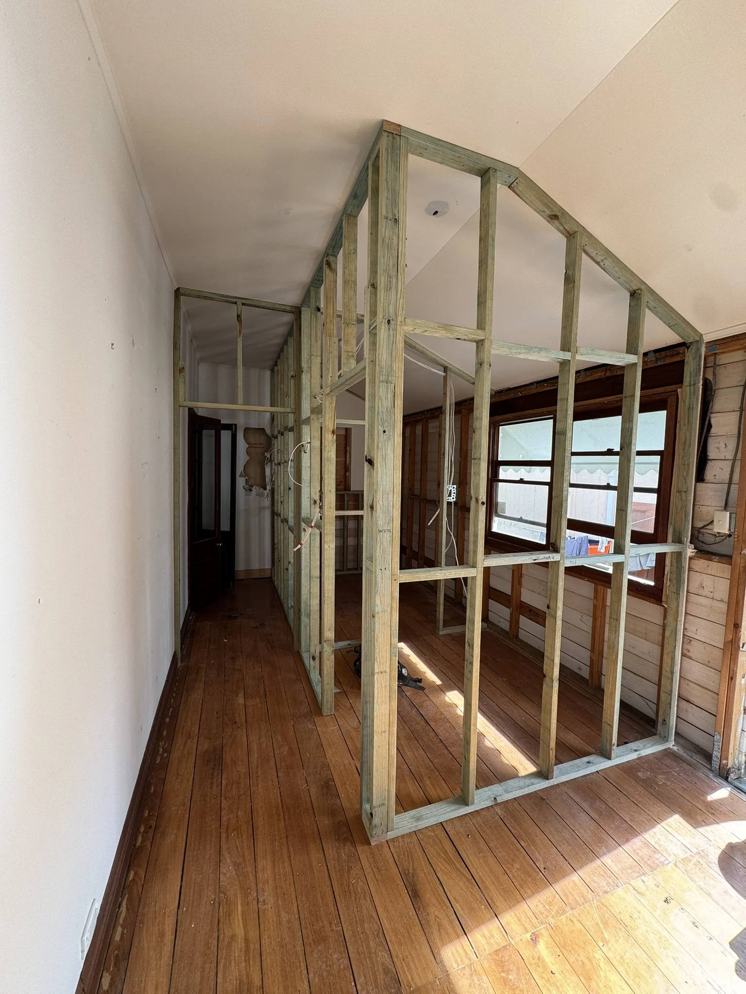 Refit to the coach house with new walls, fix / straighten the existing new ceiling framing and install the updated existing windows.